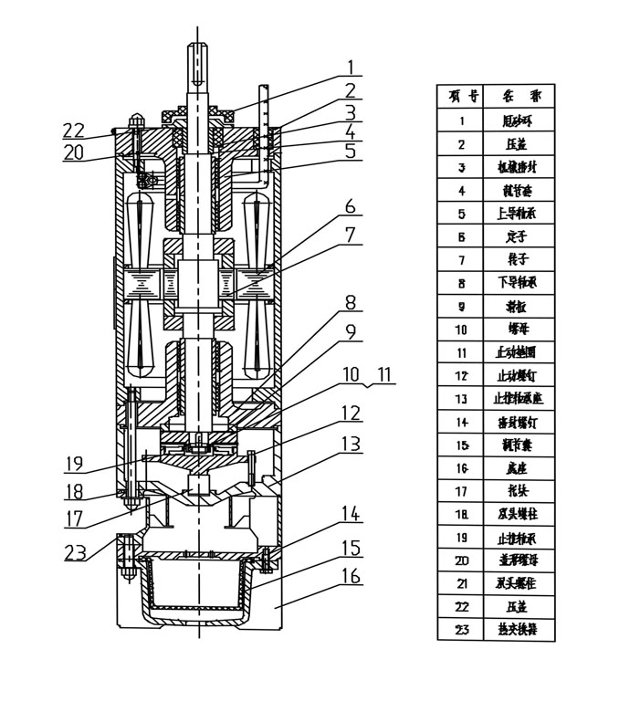 注:高推力型軸承需特殊訂貨,采用高推力型軸承的電機(jī)性能由用戶與制造廠協(xié)議。適用條件 1、電動機(jī)應(yīng)完全潛入水中立式(或臥式適用),其潛入深度不大于70m,最低位置距海底不少于5m。 2、介質(zhì)水溫不高于30℃。 3、水中固體雜質(zhì)含量(重量比)不超過0.5%。 4、介質(zhì)水中不含腐蝕性物質(zhì),PH值在7.9-8.6范圍內(nèi)。 5、電機(jī)運(yùn)行時內(nèi)部應(yīng)充滿潔凈的清水(可加防凍液)。 6、功率范圍: 11.2kw—180kw(2級轉(zhuǎn)速) 33kw---620kw(4級轉(zhuǎn)速) 適用場合:水井 6”、8” 、10”、12”、16” 或水池、水坑中。 設(shè)備特點 ★ 電機(jī)防護(hù)等級:IPX8,絕緣等級為F; ★ 采用德國引進(jìn)技術(shù),具有結(jié)構(gòu)簡單、運(yùn)行可靠、使用壽命長、維修方便、力能指標(biāo)高等優(yōu)點 ★ YQSH系列井用潛水三項異步電動機(jī)為濕式充水密封性結(jié)構(gòu) ★ 不銹鋼304材質(zhì)(特殊材質(zhì)316、316L、3861錫青銅須定制) ★ 耐腐蝕,硬度大 ★ 電動機(jī)運(yùn)行性能穩(wěn)定噪音極小 ★ 用戶需要時可以臥式使用(但壽命是立式的60%) 電動機(jī)結(jié)構(gòu) 1、 潛水電機(jī)由定子、轉(zhuǎn)子、上下導(dǎo)軸承、下連接法蘭、底座、軸伸密封裝置等組成。 2、 潛水電機(jī)各止口連接處采用密封圈密封;軸伸密封根據(jù)水質(zhì)含砂量多少,選擇不同方式的密封裝置。(含砂量大于0.01%時采用橡膠骨架油封;含砂量大于0.01-0.5%時采用機(jī)械密封) 3、 電動機(jī)下部裝有橡膠調(diào)節(jié)囊,其作用為當(dāng)電機(jī)內(nèi)部熱脹冷縮時及電機(jī)外部水位高低變化時,用以平衡電機(jī)內(nèi)腔與水的壓力。 4、 電動機(jī)定子繞組采用耐水絕緣線,有良好的絕緣能力,繞組線與耐水JHS型電纜連接。 5、 海水潛水電機(jī)上、下導(dǎo)軸承座內(nèi)裝有軸瓦,轉(zhuǎn)子下部裝有止推軸承。止推軸承由上、下止推軸承及滑板組成,用于承擔(dān)軸向力。 技術(shù)支持 1、保證電機(jī)的引出電纜處端電壓為380(1±5%)V,頻率為50(1±1%)HZ同步轉(zhuǎn)速3000r/min。 YQSHD系列潛水電動機(jī)工作的額定電壓為460,三相交流為60HZ,同步轉(zhuǎn)速3600r/min。 2、電機(jī)的******運(yùn)行電流不得大于銘牌上的標(biāo)定值(即額定電流,配套廠家和用戶在選用和調(diào)試潛水電泵機(jī)組的電源控制設(shè)備時,應(yīng)特別注意); 3、電機(jī)應(yīng)選用合適的控制方式(可實現(xiàn)電機(jī)的過載、欠壓、斷相運(yùn)行的保護(hù)并可根據(jù)水位自動控制電泵的起停); 4、電機(jī)為連續(xù)工作制(S1)。兩次起動時間間隔不得小于10分鐘; 5、電機(jī)應(yīng)可豎直使用,也可臥式使用(須特殊訂制); 6、用于水池或超過規(guī)定的井徑中時應(yīng)加裝散熱器,使電機(jī)表面的水流速度達(dá)到0.5-1m/s,以保證電機(jī)良好的散熱。散熱器應(yīng)將電動機(jī)和第一,二級泵包括在內(nèi)。 注:當(dāng)環(huán)境水或電網(wǎng)電壓、頻率不符合上述規(guī)定時,用戶可以提出要求,本公司提供訂制適用產(chǎn)品。