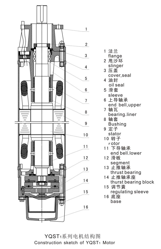 概述 YQST系列大容量潛水三相異步電動機是應(yīng)國際市場需要,在小井徑中發(fā)展大容量電機而專門開發(fā)的一種新型潛水電機,他特別適用于高揚程潛水泵配套提取地下水,為城市工礦企業(yè)、農(nóng)業(yè)灌溉及居民生活提供生產(chǎn)和生活用水。本產(chǎn)品除具備一般井用潛水電機特點外,還具有單機容量大,力能指標(biāo)高,承受軸向力大,密封性能好等特點。為了適應(yīng)用花需要,電機機殼可采用不銹鋼材料,但需在合同中注明。 型號說明